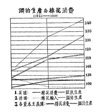 一九三五年九月以前,英国钢铁的消费较前年增加了百分之十六·五,但棉花的消费比较反而降低;美国棉花的消费增加了百分之二,但钢的生产却增加了百分之十七·五。德国在八月以前,生产水平较之前年增加了百分之十四,但其消费品(棉织品等)的生产指数却降低了百分之六·六,机械生产(军械在内)则增加了百分之三十五·二。意大利从一九三四年八月到一九三五年八月,机械生产增加了百分之四十一·七,但纺织工业的生产额却减少了百分之十五·八。至于我们的强邻日本之增加预算、扩张军备而造成了军事工业的景气,那是我们平素熟知的事情。