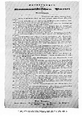 卡·马克思和弗·恩格斯写于1848年3月21日—29日之间,1848年3月30日左右在巴黎印成传单:并载于下列各报:1848年4月5日“柏林阅报室”第82号的号外;1848年4月6日“曼海姆晚报”第96号;1848年4月6日“特利尔日报”第97号的附页和1848年4月9日“德意志总汇报”第100号的附刊,而在1848年9月10日之前在科伦又印成传单发表 原文是德文 俄文译自“柏林阅报室”,并照科伦的传单原文校对过 |