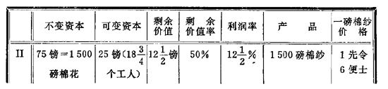 | Ⅱ | 80镑=800磅棉花 | 20镑=10个工人 | 10镑 | 50% | 10% | 800磅棉纱 | 2先令9便士 |