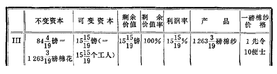 | 不变资本 | 可变资本 | 剩余价值 | 剩余价值率 | 利润率 | 产 品 | 一磅棉纱价格 | |