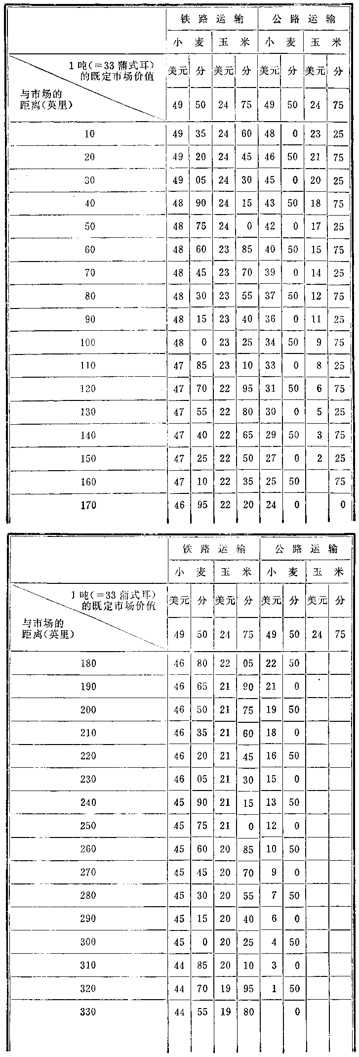 “普通公路运输的经济可行性限于较短的距离——显然取决于货物的性质和道路的质量。用这种道路运输的花费平均每吨1里约15分(1/7美元),这大体上是国内相当准确的价格。如果同时考虑到,小麦的价值每蒲式耳是1+(1/2)美元,玉米的价值是75分(3/4美元),33蒲式耳等于1吨,那么小麦的价值等于它运输330英里的费用,玉米的价值等于它运输165英里的费用……但是,还有用铁路运输的可能性,费用是1英里1.5分,或等于公路运输费用的1/10。因此,上述商品运输在经济上的极限分别扩大到3300和1650英里。在这些商品用普通公路运输时成为经济界线(极限)的那一点上,[32]用铁路运输的小麦每吨还值44美元50分,玉米每吨还值22美元20分,——这些数额代表由于完成这种工作而造成的价值的实际增大。