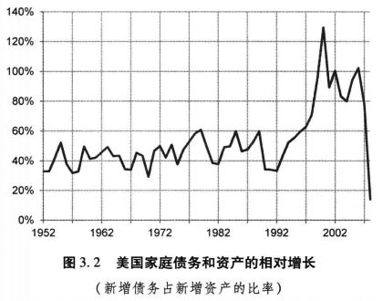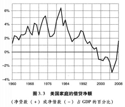 尽管家庭对资产——包括金融资产和有形资产——的需求快速上升,但他们的债务同样也快速增加。平均来说,自1952年至1992年,债务的增长为家庭44%的新增金融和有形资产提供了资金——余下的部分则是人们用其实际收入来购买的,并且在此期间对均值的离差较小(见图3.2)。但接下来出现了1990年代的网络公司“繁荣”和2000年代的“繁荣”,这两次繁荣都是由大量不断增长的债务所催生的。到1999年,新增债务在新增资产中所占的比例达到96%,这意味着增加的资产中除4%以外都是用借来的钱买入的。这一状况一直持续到最近这场危机爆发;自1999年至2006年,新增债务占新增资产的平均比例是94%。因此,尽管在1992年家庭(经由银行存款等方式)贷出款额超出其借入款额的数量相当于全国GDP的2.9%,但此后他们日益转变为借款人(见图3.3)。到2005年,家庭借入款额超出其贷出款额的数量相当于GDP的2.9%。[5]