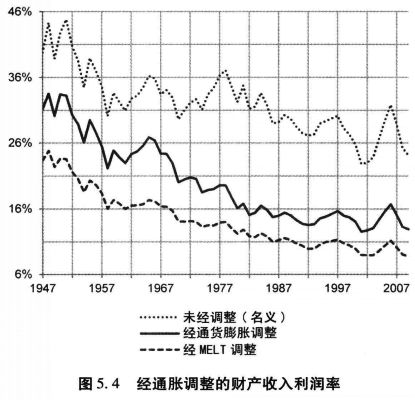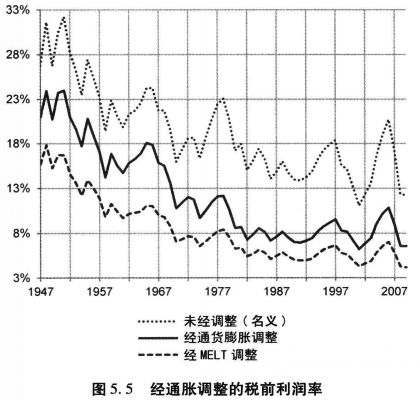 图5.4和图5.5显示了二战以后三个利润率的轨迹,它们是:经通货膨胀调整的利润率,经MELT调整的利润率以及用于比较的未经调整的利润率。总体来说,调整并没有显著地影响利润率的趋势,尽管它们导致利润率远远低于未调整的利润率。1970年代这个通货膨胀不断迅速加速的时期是这一总体结果的一个主要的例外。1970至1979年期间,名义(未调整的)利润率大幅上升,但4个经过平减的利润率中有3个下降了。(余下的那个经过平减的利润率——即经MELT调整的税前利润率——上升了3%,而与它对应的名义利润率上升了30%。)