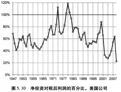 换句话说,美国公司正在进行的投资所需要的税后利润超出了它们实际获得的税后利润。由于股息仍在继续支付,这意味着公司正在耗尽它们提留的、用于替换和维持其实物资本的资金。这种情况显然是不可持续的,所以,自1983年起,用于积累的利润份额开始显著下降。但重要的一点是它回落到了正常水平。自1983至2001年期间,净投资平均等于税后利润的64%,远高于1947至1972年期间的平均水平(57%),略高于1947至1978年期间的平均水平(61%)。[16]
