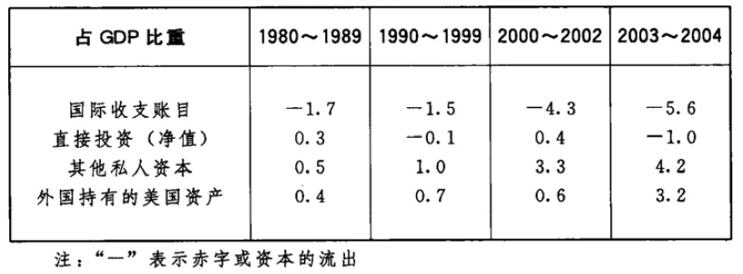 对美元过高的期望和高科技高峰的瓦解,极大地推进了国际贸易中心产品的出口,同时也使美国出口产品遭受了重大的损失,在2000年~2003年间损失了世界市场份额的1/5。持续上涨的经常账赤字反映了产品日益上涨的赤字,甚至劳务项目也少许下降至21世纪初的水平。到2004年,美国政府和海外企业的债务已经超过了美国国内外企的总资产,债务相当于国民生产总值的30%。即便如此,海外投资的净收益仍有富余,尤其是美国企业直接投资的海外企业及其子公司的回报率最高。虽然在20世纪80年代,有大量的投资资本流入美国,尤其是在新经济高峰期,大量的资本注入美国现有的资产,产生的回报却低于美国跨国公司在新的生产设施方面直接投资所得的回报。不过,如果流动资金持续降低,海外债务继续堆高,那么投资收入将入不敷出,使经常账赤字进一步恶化。如果基本的经济名义增长率为5%(即增长率3.5%,通货膨胀率为1.5%),长期持续的经常账赤字为国民生产总值的5%,则意味着海外负债率持续上涨,为国民生产总值的100%。