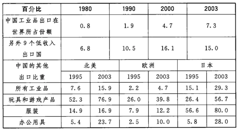 在日本,相对有限的工业产品进口中,来自中国的工业产品占了将近1/3。中国对欧洲和北美的出口量大于日本。10年内,每一种产业的市场份额都或多或少翻了一番。中国进口以玩具和游戏产品为主,40%服饰从低收入国家进口,目的是在“多纤维协定”结束之际,配额正在逐步减小时,获得更多的市场份额。办公室设备中有一些已经采用高科技装备,并且发展迅速。2002年,中国取代了欧盟和墨西哥,成为美国在计算机、电子生活产品和其他IT产品方面最大的出口国(虽然大多数出口产品是从国外进口的组装品或高科技零部件)[1]。中国正在大力发展生产力,以生产更多高精尖产品。到2010年,中国的科学家和工程博士可能要比美国多。在4种高新技术的研究发表物方面,中国位居第4,仅次于美国、日本和德国。许多跨国公司都使研究设施置于中国。这将使中国更快地发展,因为中国每年都有大量的科学家和工程博士毕业。