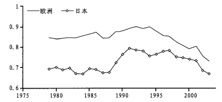 图4.1 欧、日、美制造业生产力对比(1979~2003)