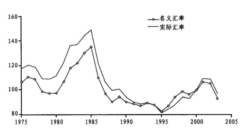 在20世纪80年代初期,美元实际汇率增值40%,到20世纪80年代末期和20世纪90年代初期开始下降。20世纪90年代初期,随着美国成本相对地提高,美元贬值只是票面价值贬值。尽管如此,对于美元每一次大的震荡,都是名义汇率的跌宕占主导地位。