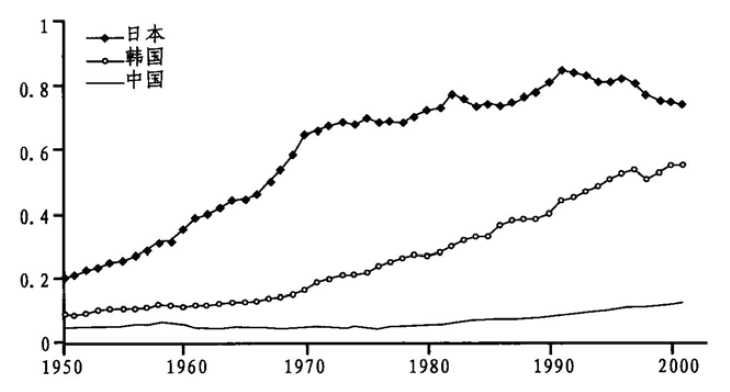 中国经济的增长在世界贸易活动中是显著的,但是,也有比中国的经济发展更出色的国家。比如,中国在资本积累方面是模仿日本,在出口方面模仿韩国。图4.6指出,中国出口额还没有达到日本其次是韩国和台湾地区在20世纪80年代和90年代在世界贸易中的出口额。即便如此,日本的出口收益增加过程与中国相比,是缓慢和漫长的,中国的出口收益增加过程只有20世纪80年代的新兴工业国家才能与之相媲美。在过去的40年里,新兴工业国家竞争力的迅猛增强成为一个持续的趋势,中国的出口增加只是这种趋势的新表现,而不是一种新现象。