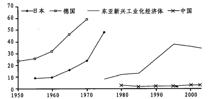 在“黄金时代”,进口竞争日益激烈是显而易见的,但是日本是个例外。1974年后,它一直稳定地占有欧洲2倍的进口市场份额,是美国的3倍多。这些竞争大多数来自于一些OECD成员国。虽然从南部进口产品发展也很迅速,占美国国内市场近1/10,但在其他发达国家却很少,因为中国占有主导地位。