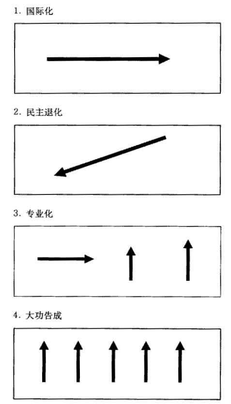 图7. 1中向右的箭头代表了广泛的国际化,它意味着地方、区域甚至可能国家层面的社会运动正逐步让位于国际层面和全球层面的社会运动。向左的箭头意味着超大范围的社会运动日薄西山,而新的地方主义可能兴起——目前看来,这一可能性不大。图中向上的箭头顶端,表示的是社会运动的普遍扩张和转型;箭头中间以上部分表示的是广泛的制度化:即社会运动在全世界的各个层面上展开,而主导社会运动的是非政府组织、专业化的社会运动企业家,以及与政权有着亲密关系者。箭头中间向下的部分,表示的是社会运动的衰落或消亡。不过,这些都只是笼统地描述,更为准确的预测应当勾画不同层面社会运动的各自发展轨迹:例如,跨国社会运动的扩展与转型,以及与之伴生的地方社会运动的萎缩与制度化。