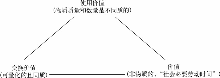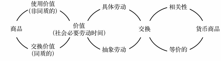在下面的分析中我们会看到,使用价值、交换价值和价值处于长期的、有时是紧密的联系中。马克思很少将其中的任何一个概念分隔开,这是因为重要的是它们之间的关系。然而,他经常研究其中两个概念之间的关系,而将第三个默默地放在一边。在第二部分有关商品的劳动二重性的研究中,马克思聚焦于劳动的使用价值和这种有用的劳动所蕴含的价值(保持交换价值不变)之间的关系。在之后的部分中,他忽略了使用价值,并考察了交换价值和价值之间的关系,以解释货币的起源和作用。重点是,要注意这些未及详述的马克思研究焦点的变化,因为任何部分中的论述都是以相关概念的提出为条件的。