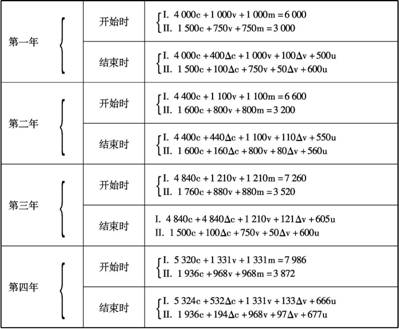 与年初的总产出9000相比,两大部类第一年年末的总产出达到了9800。但是注意,第II部类从第I部类购买的1600c与第I部类对消费资料的需求1100v+500m是相等的。增长过程产生了一个奇迹般的和谐:确实,增长和新的资本积累使得原本不平衡的地方变得和谐了。当然,马克思仔细地选择了他的数字和条件使这一结果能成立。但他因此也证明了和谐的资本积累的可能性(绝不是一种概率)。他使这一进程看起来好像能不断持续下去。表1显示了这一过程持续四年的结果。它可以无限期地持续下去(所有其他条件保持不变)。