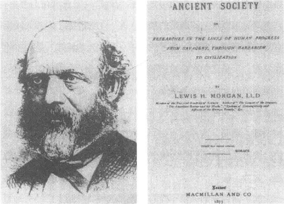 美国法学家、民族学家、考古学家路易斯·摩尔根和他的著作《古代社会》(1877年伦敦版扉页)