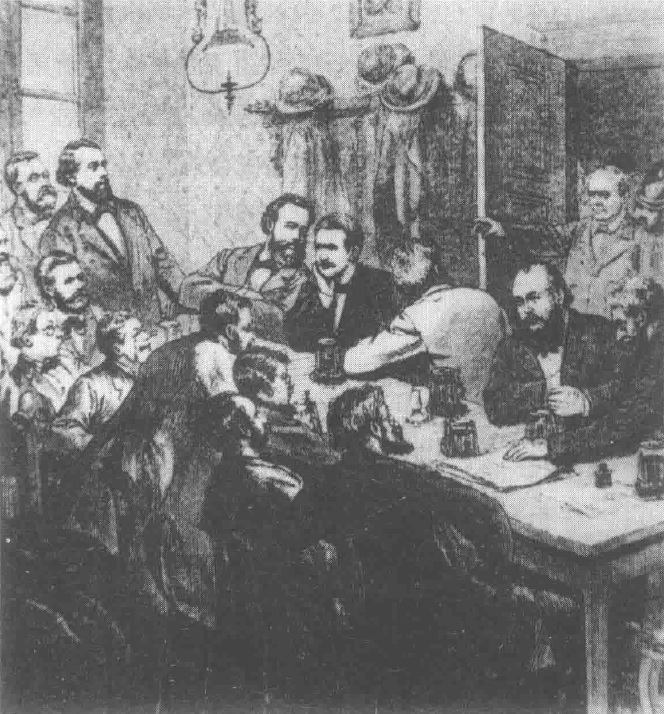 1881年李卜克内西和倍倍尔在莱比锡参加社会民主党人秘密会议