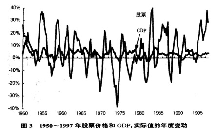 图3 1950~1997年股票价格和GDP,实际值的年度变动