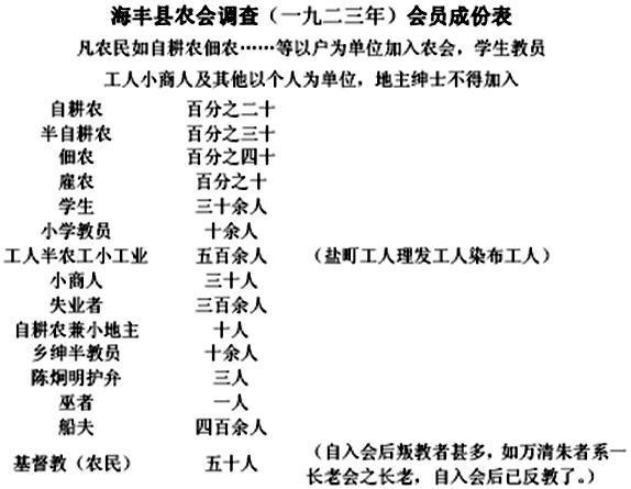 此时农会并发出有宣言(须待查检)及农会利益(须带查检),兼之无论何日何夜,我们必到乡村去宣传。到了十月份,加入农会会员每日平均有二十人了。由赤山约而平岗约,银镇约、青湖约、河口约、西河约、公平约、旧墟约……十余约,都成立了约农会,把县城东西南北都包围起来了。这个时候,我们就筹备海丰县总农会。 这个时候,农会就发起组织了一个济丧会,由会员自由加入,约百五十余人,无论那个会员的父母或自己死了,由各会员挪出两毫钱来济丧。此方法宣布后,第一日即有某会员的父亲死了,各会员挪出两毫钱,共约三十余元,同时会友并往致祭,行送丧的礼节,农民益加欢喜。到了第五日,又有会员的父亲死了,这个时候,济丧会的会友无法负担,乃先由农会代出,另日由济丧会筹还。到了第七日,又有一个会员死了,再由农会代出三十元。这个时候,济丧会会员吓了一惊,成立未十天而死者五六人,倘继续下去,如何办法呢?乃开全体会员大会,宣告临时停办,俟农会财政充裕时,始继续办理。 又办了一间农民医药房,在海丰大街,由一热心农民运动之西医生某君担任医生,凡农会会员有病须药者,准由该会员执会员证到来领药,药价仅收一半,非会员则全收。请诊症者如遇会员,不取诊费。并由该西医之老婆担任接生,凡遇会员不收接生费,仅取药费一半,大约二三角钱。自是领药接生者甚众。甚至有非会员而借会员证去领药者亦有之,乃在会员证中加数条规则以限制非会员借用,并规定会员证失落补领费二毫。 到了民国十二年,新历一月一日,乃海丰总农会成立大会,此时加入会员已达二万家户,以农会管辖下之人口计,有十万人[6],以全县人口比较,占全县人口四分之一。是日各乡代表到者共六十余人。开会秩序:(一)主席宣布开会理由,(二)各代表报告,(三)主席报告筹备经过,(四)演说,(五)选举,(六)讨论章程,(七)提议,(八)欢宴。结果选出彭湃为正会长,杨其珊为副会长,蓝镜清为财政,林沛为庶务,张妈安为调查……(其余忘记)。总农会之组织图表如下: