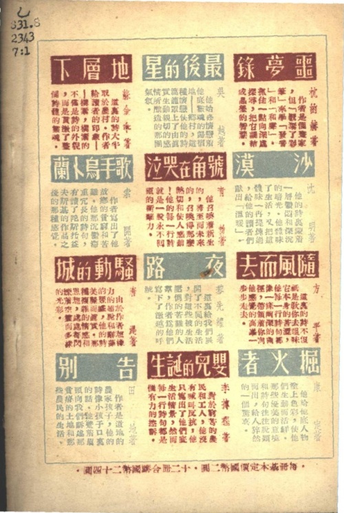 为了篇幅和事实的限制,先耀的诗,只挑了这四篇留在这里,他初期的短章,和最近的那激越呼号,我们没缘看到或听到了。这几篇东西,给我们展开了不同的生活,而所谓生活,实在不能算是生活,连衬托它的背景都是涂着那么灰惨惨的色调。为什么他不写别的而写了这一些呢?因为他熟习这些,对于这些被生活压倒的苦难人群,他有种亲切的感觉,这种亲切,如其说出发于同情,宁说来自于不平。他同他们都是赶「夜路」的同伴,一样在受着熬煎。他的诗句,随着情感进展,进展得很自然,不放纵也不局促。有时,把精华无意地结穴在一个句子,甚至一二个字上,而不使人觉得他在雕琢。