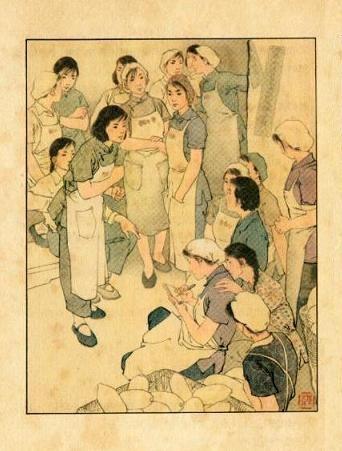 “想想从前的生活多难做,我看见姊妹们跑来跑去,上气不接下气,额角头上直流汗,断头还是接不完,这边接了,那边断了,接上去又断了。我当时心里也急的慌,真想上去插把手,帮帮忙,可是每排车都是这样,帮哪个忙好呀?我一双手,也帮不了多少忙啊。阿英姐姐因为生活难做,那天夜里累得早产了,我把医生叫来,连看也不敢看一眼。想起来,真气人呀。重点试纺一开始,情形就完全两样了呀。姊妹们在弄堂里,不急不忙,一边做着清洁工作,一边接头,走一个巡回,也断不了几根头,生活好做的多了。我不接头,看见了心里也舒服。你们说,同样是一排车,同样是一双手,为啥从前生活难做,现在生活好做了呢?”